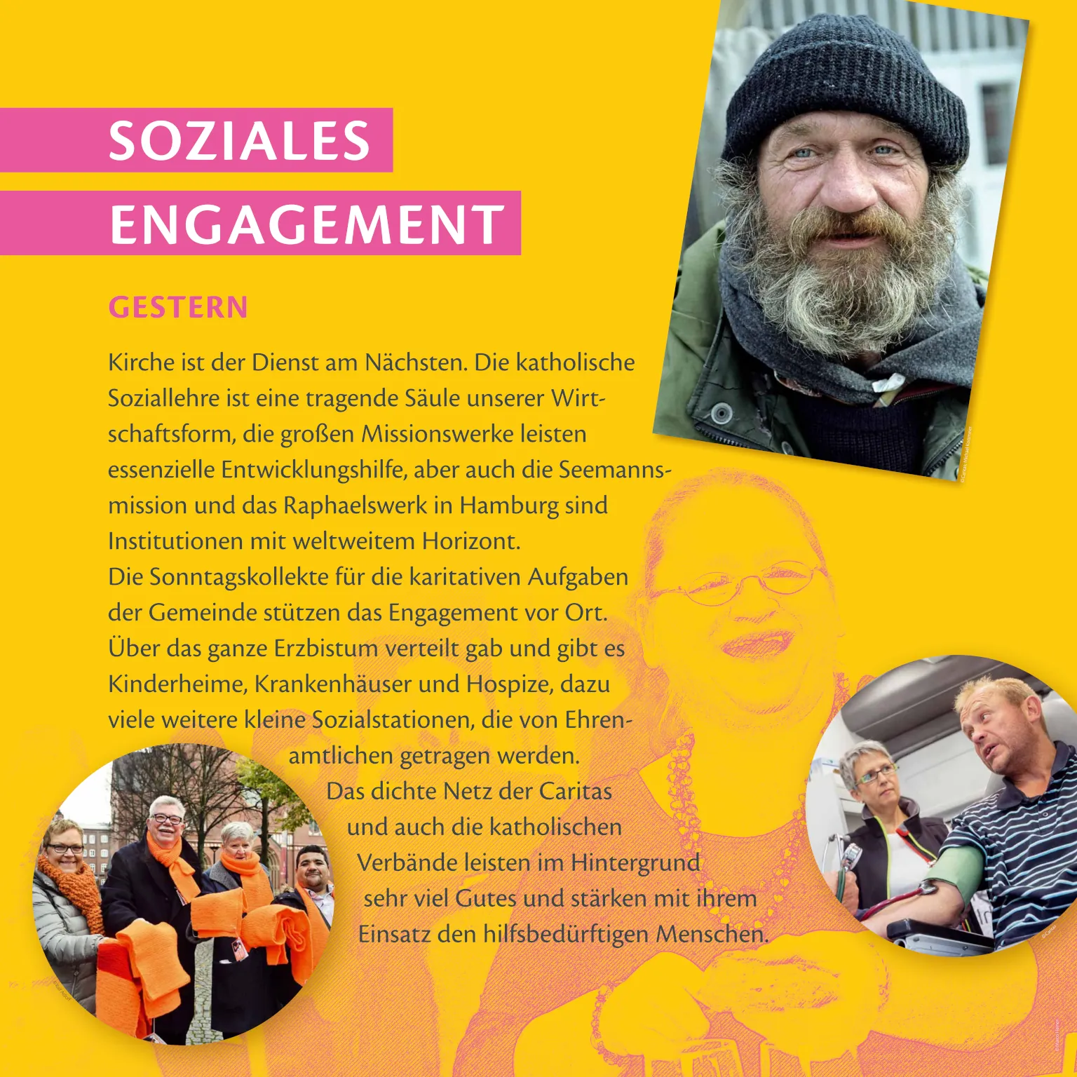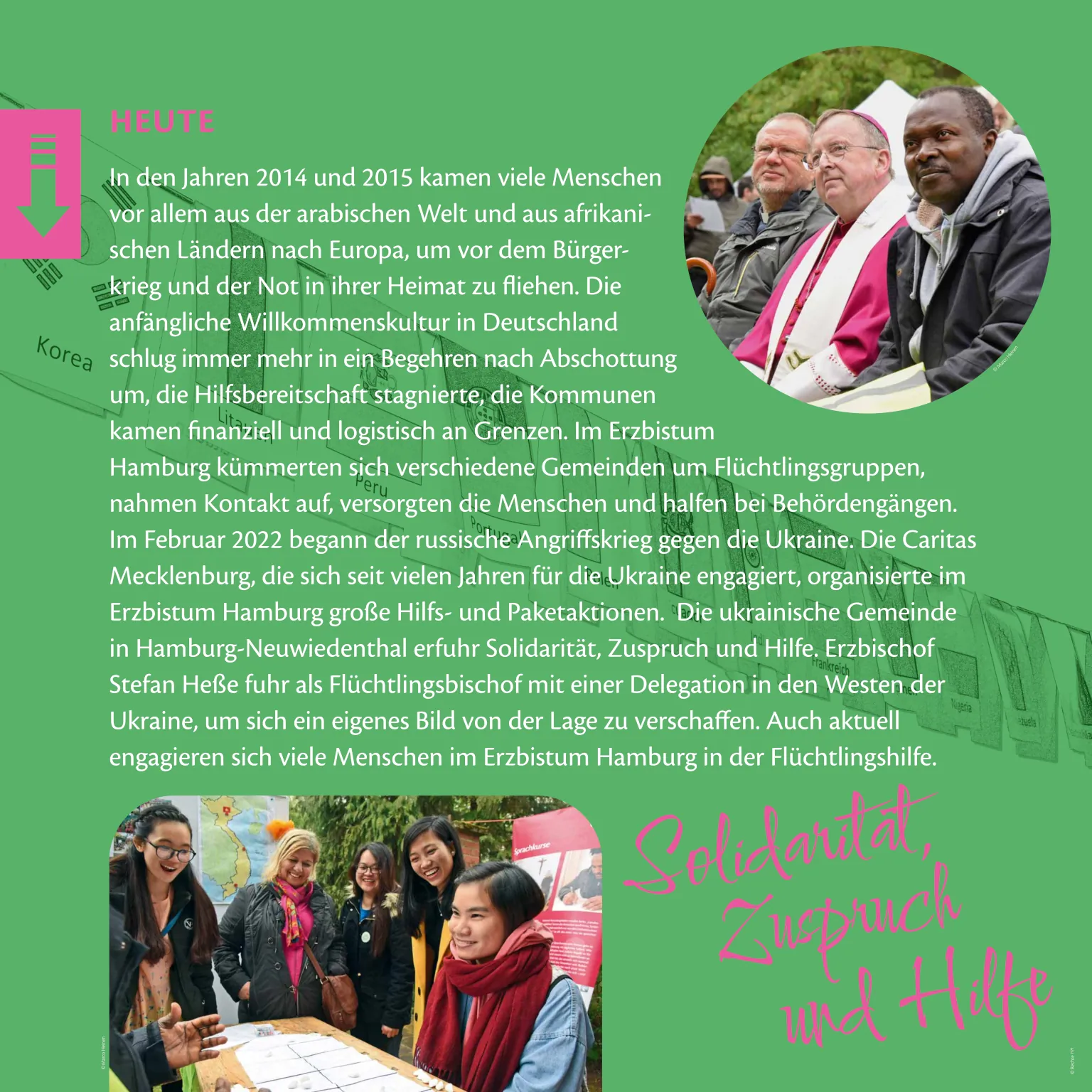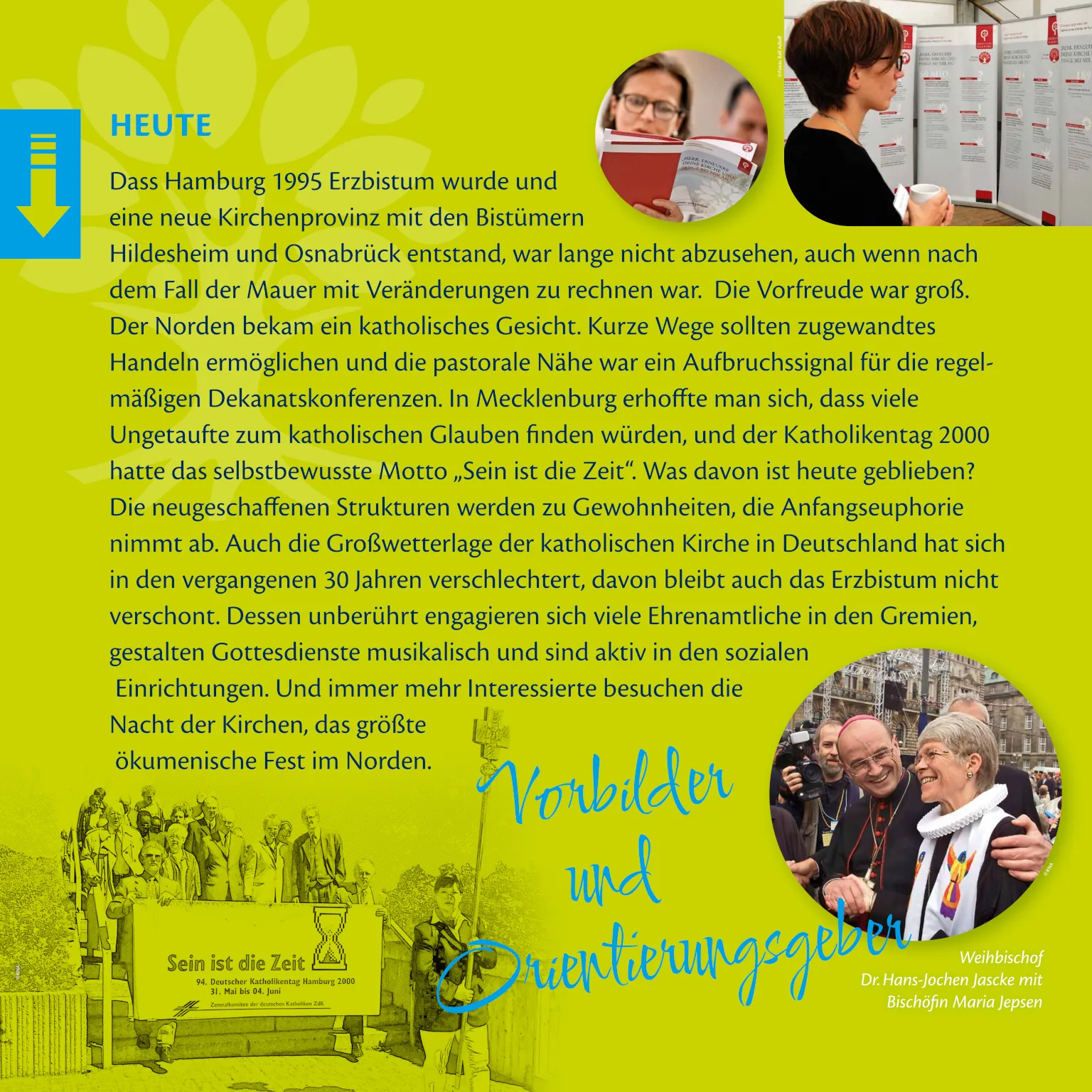 Aus diesem Anlass haben wir aktive und ehemalige Mitarbeitende und ehrenamtlich engagierte Katholikinnen und Katholiken gebeten, ein paar Highlights der Bistumsgeschichte zu kommentieren: Dazu gehören neben der Bistumsgründung 1995 der Katholikentag, der im Jahr 2000 in Hamburg stattgefunden hat, die Seligsprechung der Lübecker Märtyrer im Jahr 2011 oder auch die Bischofsweihe von Erzbischof Dr. Stefan Heße 2015.